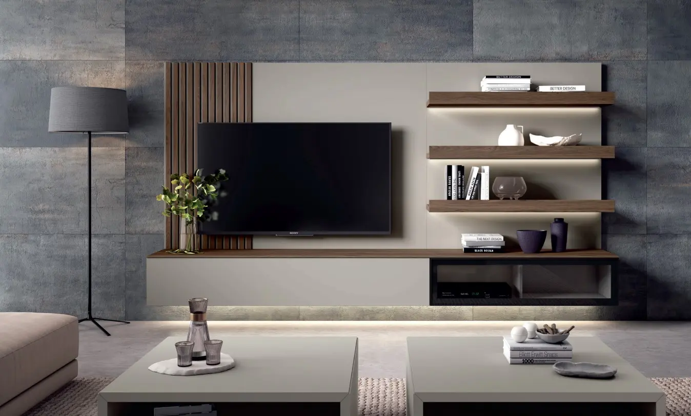 Perfecta para salones modernos donde se busque integrar la televisión, almacenamiento y decoración en un solo diseño.