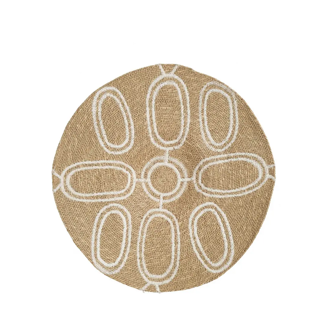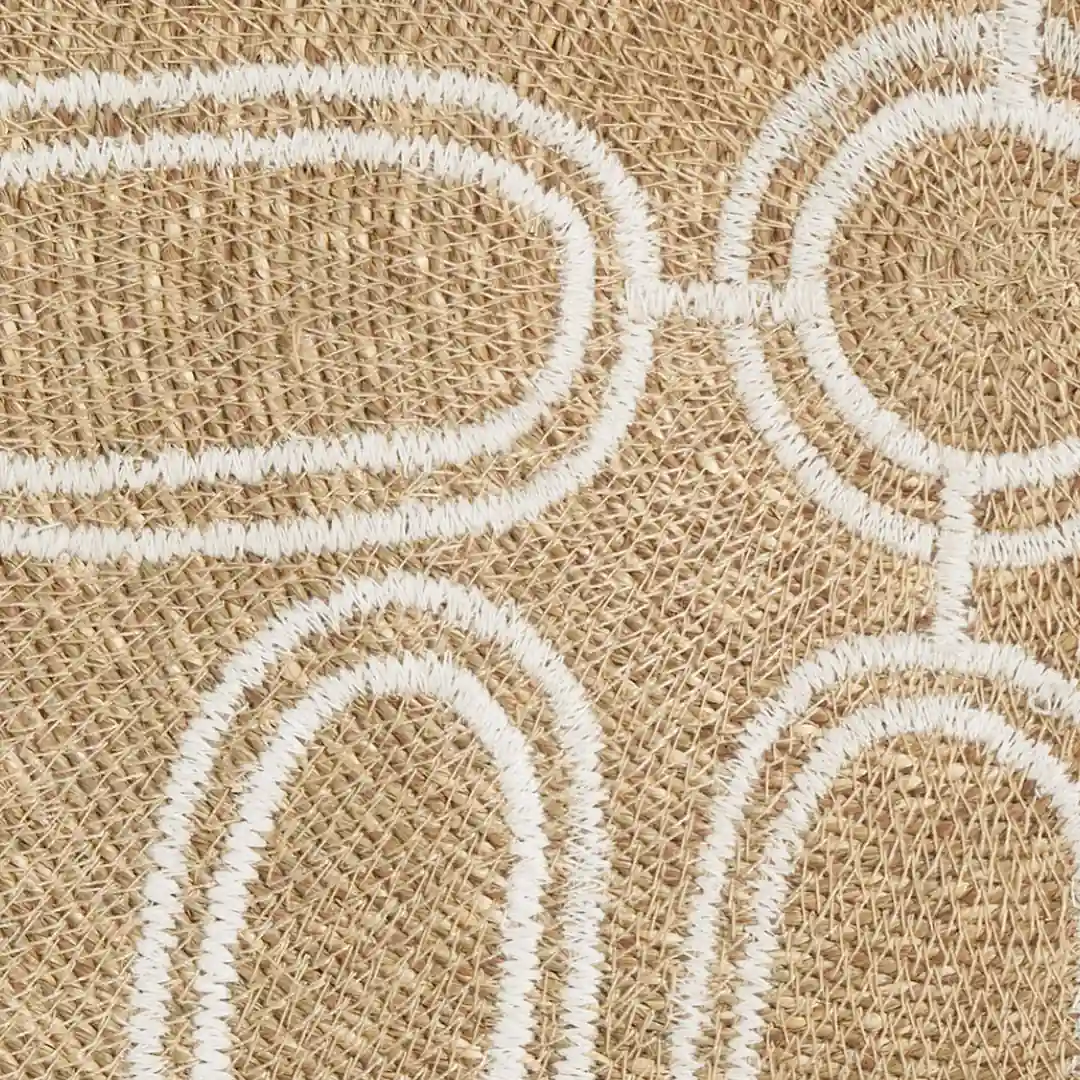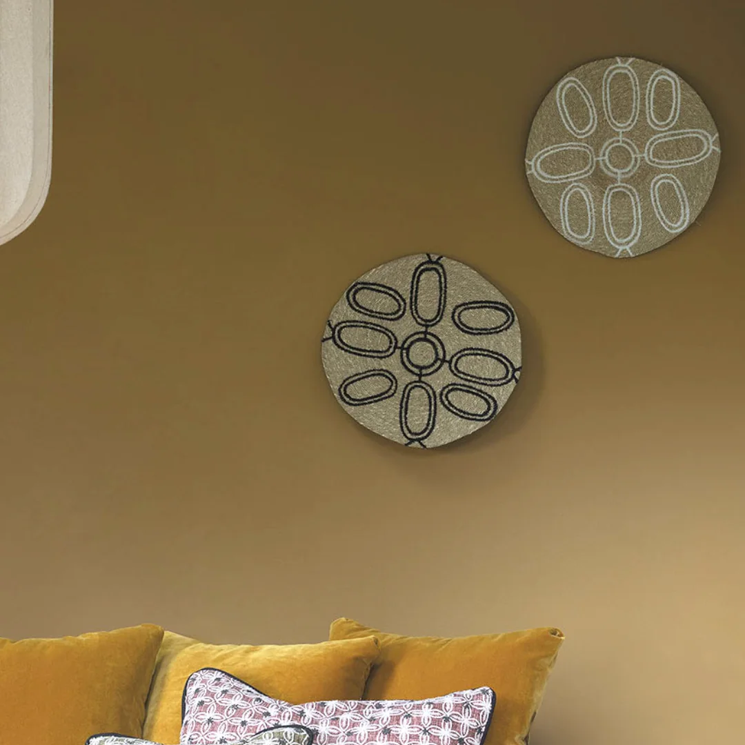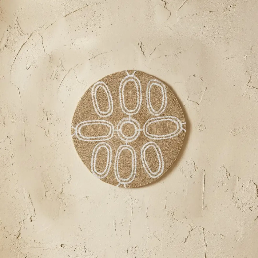 Su diseño circular y sus tonos claros y naturales crean una atmósfera cálida y relajante, perfecta tanto para dormitorios como para salones. Esta decoración mural combina tradición artesanal y estética contemporánea, encajando con facilidad en interiores de estilo bohemio, mediterráneo o natural.