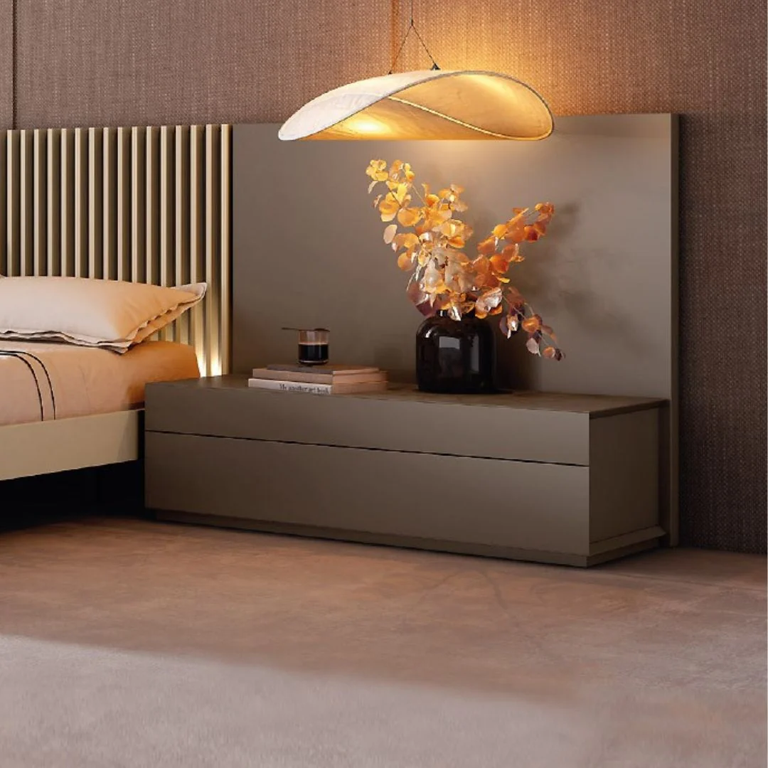 Cierre suave y estructura lacada al tono del cabecero.