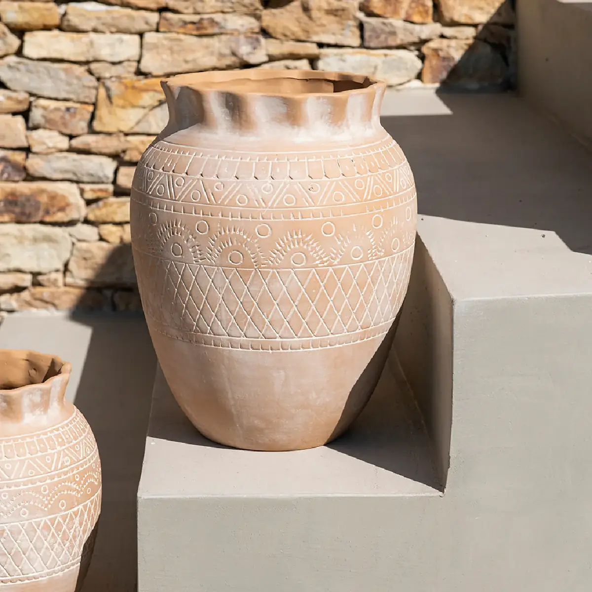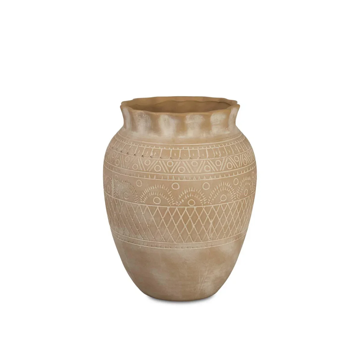 El Jarrón Binibeca destaca por sus grabados artesanales y su estética inspirada en el Mediterráneo, evocando calma y naturalidad. Su color neutro lo convierte en una pieza fácil de combinar con otros elementos decorativos como flores secas, ramas decorativas o simplemente en solitario.