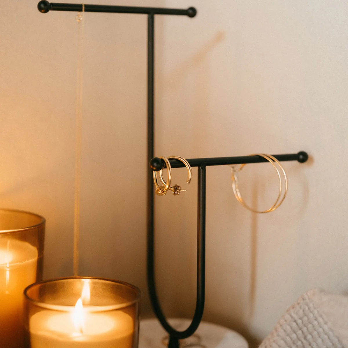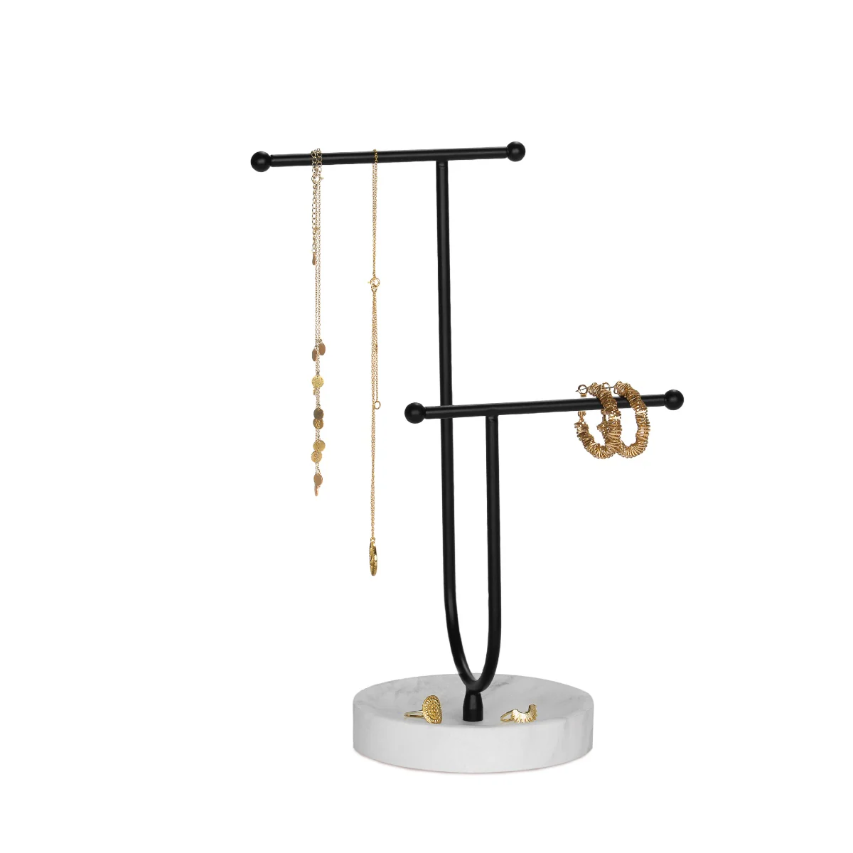 Su estructura metálica en color negro mate contrasta con la base efecto mármol en tonos blanco y gris, creando una composición elegante y equilibrada. La base actúa como bandeja organizadora para anillos, pendientes o pulseras pequeñas, mientras que la parte superior cuenta con una estructura metálica de pie ideal para colgar collares o cadenas sin enredos.