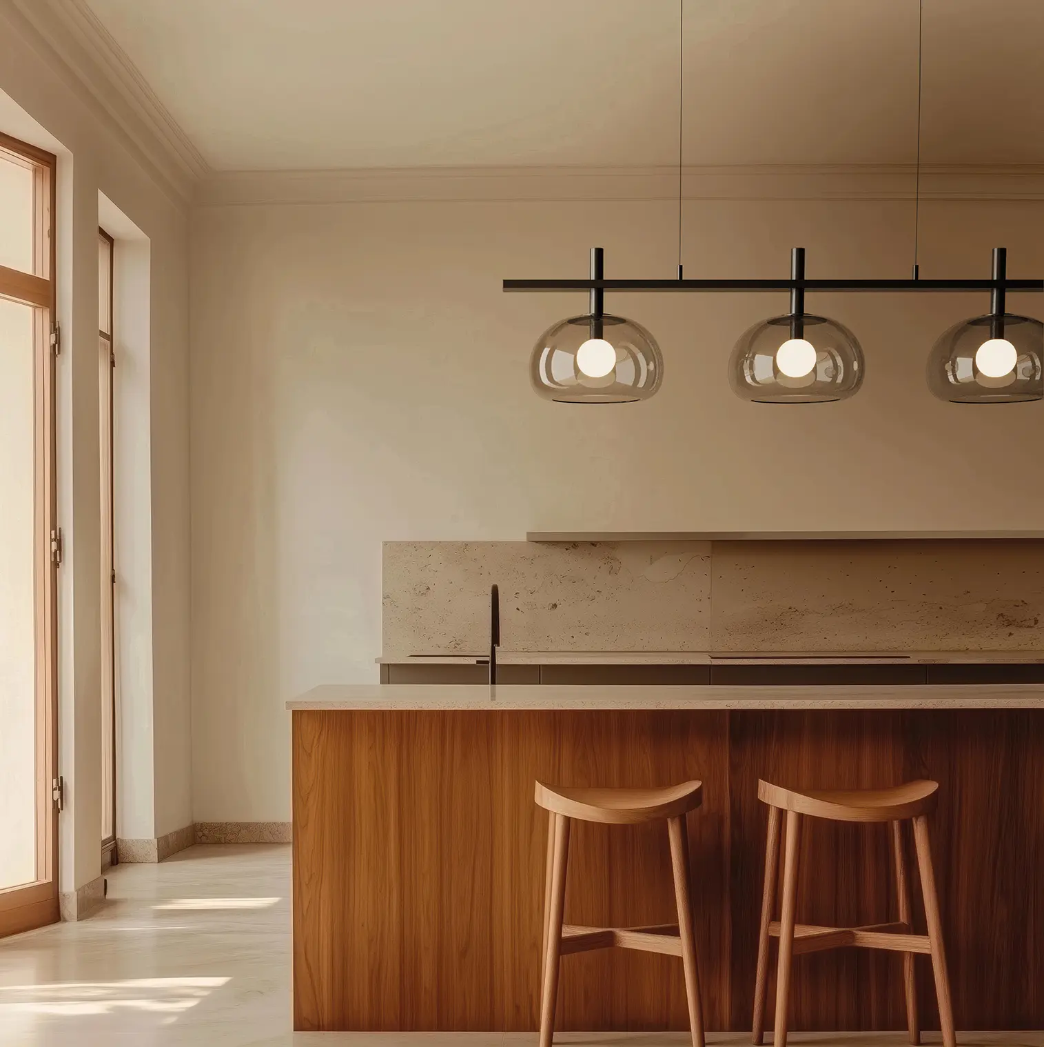 Su tulipa exterior de vidrio —disponible en acabado transparente o en delicados tonos fumé— envuelve una pantalla interior opal que suaviza la iluminación, generando una luz cálida, homogénea y envolvente. El resultado es una luminaria que no solo ilumina, sino que transforma el ambiente con una atmósfera acogedora y sofisticada.