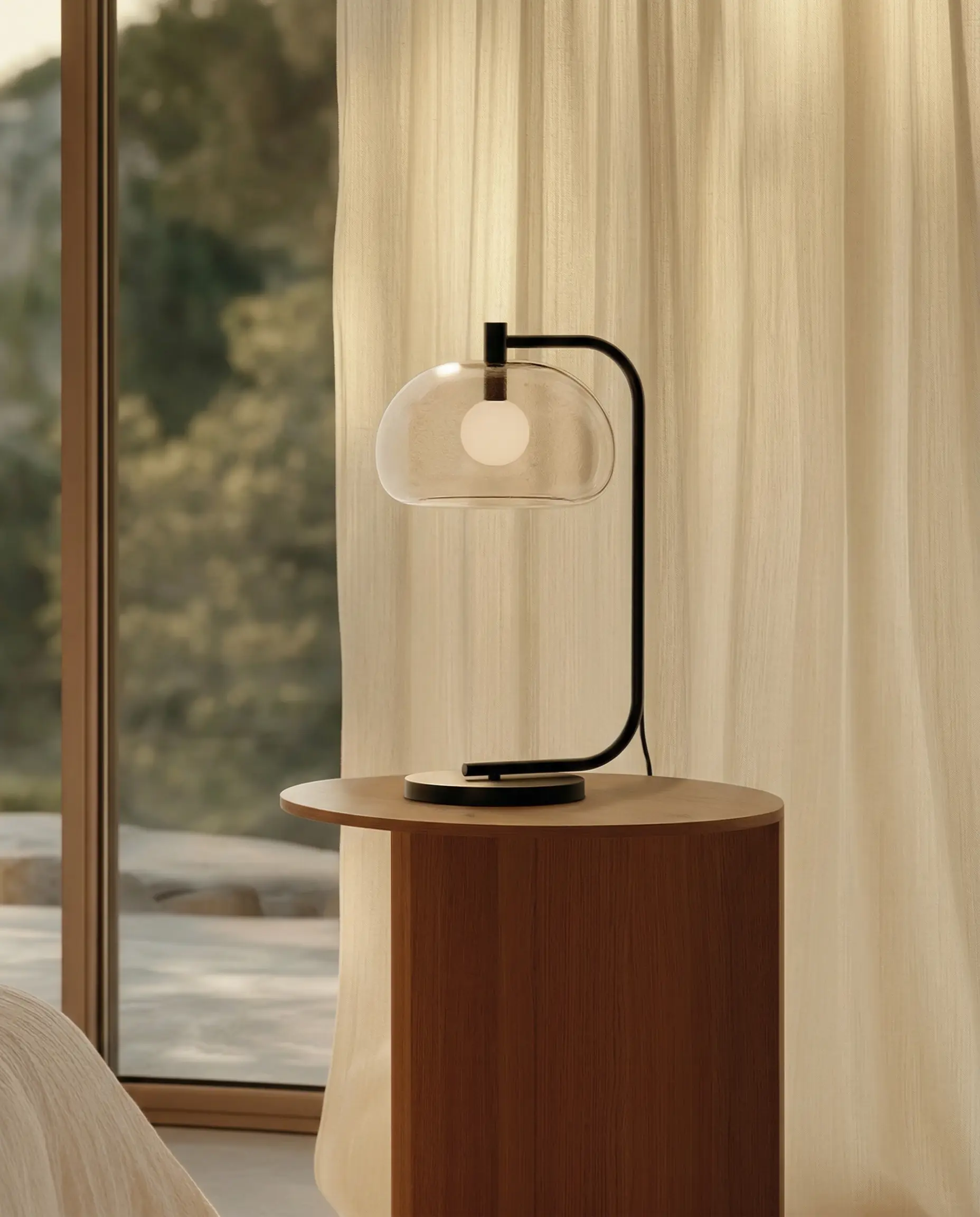 La tulipa exterior de vidrio disponible en acabado transparente o en distintos tonos fumé, envuelve una pantalla interior opal que difunde la luz de manera suave y uniforme. Este juego de capas genera una iluminación cálida y envolvente, ideal para crear atmósferas acogedoras en salones, dormitorios o zonas de lectura.