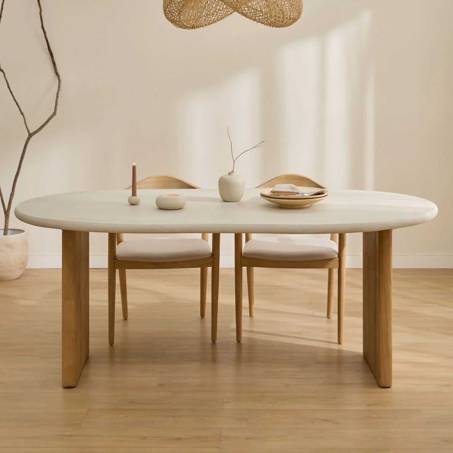 La Mesa de Comedor Liba de Wabi Home combina diseño contemporáneo, calidez natural y un acabado artesanal que la convierte en una pieza central en cualquier estancia. Su sobre de microcemento en tono beige claro destaca por su resistencia, textura suave y estética moderna, mientras que la estructura de madera maciza de Sungkai aporta estabilidad, durabilidad y un contraste cálido que equilibra el conjunto.