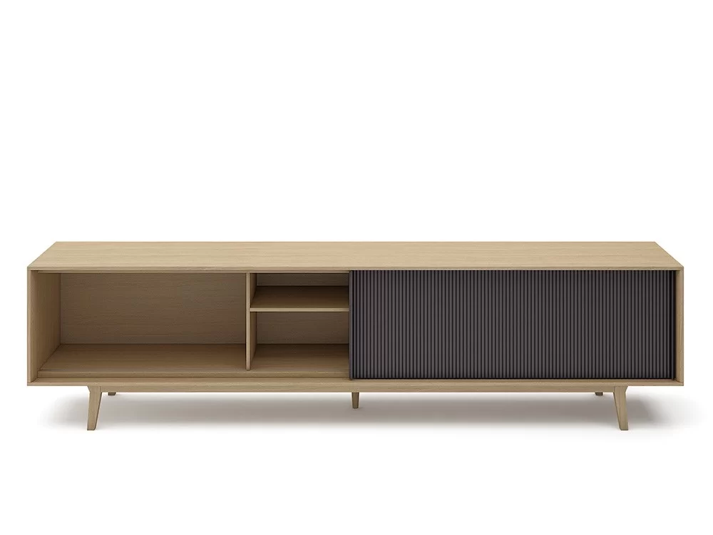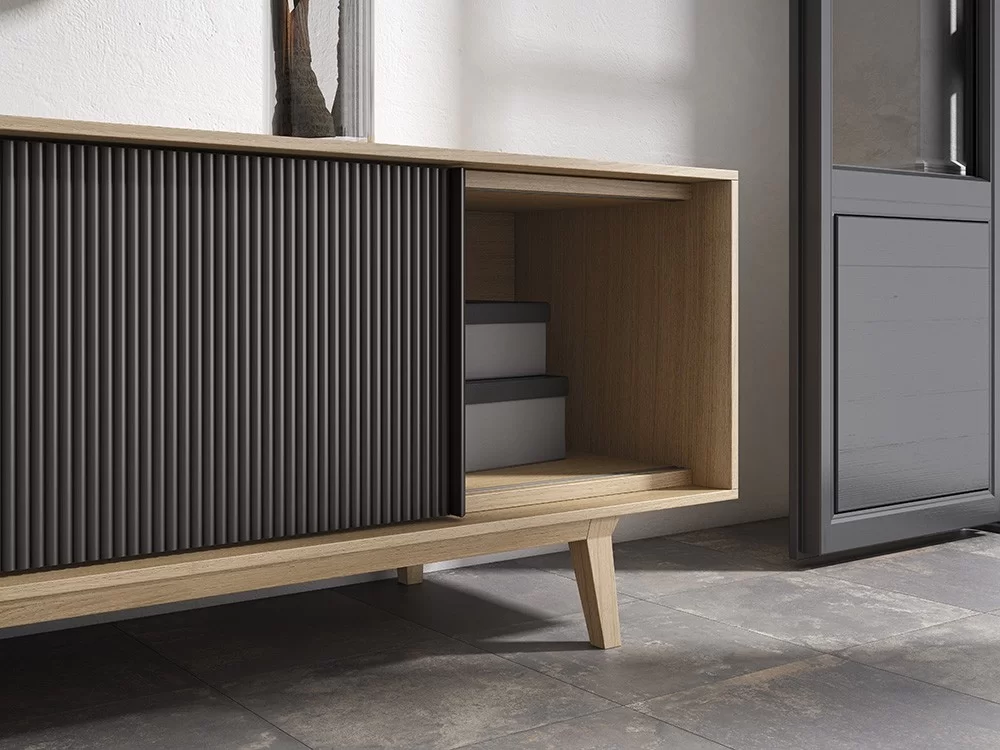 Este mueble para televisión destaca por su equilibrio entre diseño funcional y estética cuidada. Fabricado con estructura y patas en madera chapada en un elegante acabado Roble Nature, aporta calidez y naturalidad a cualquier salón.