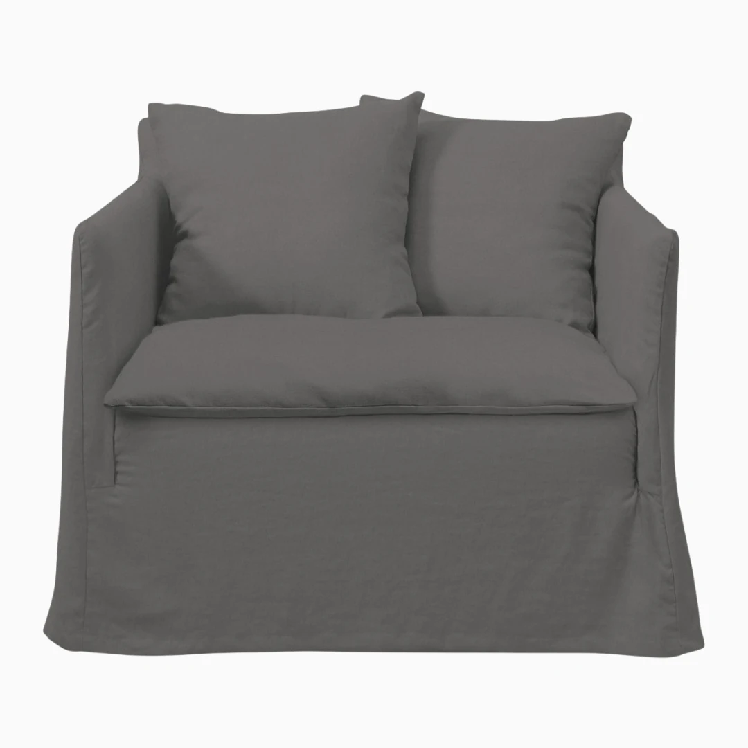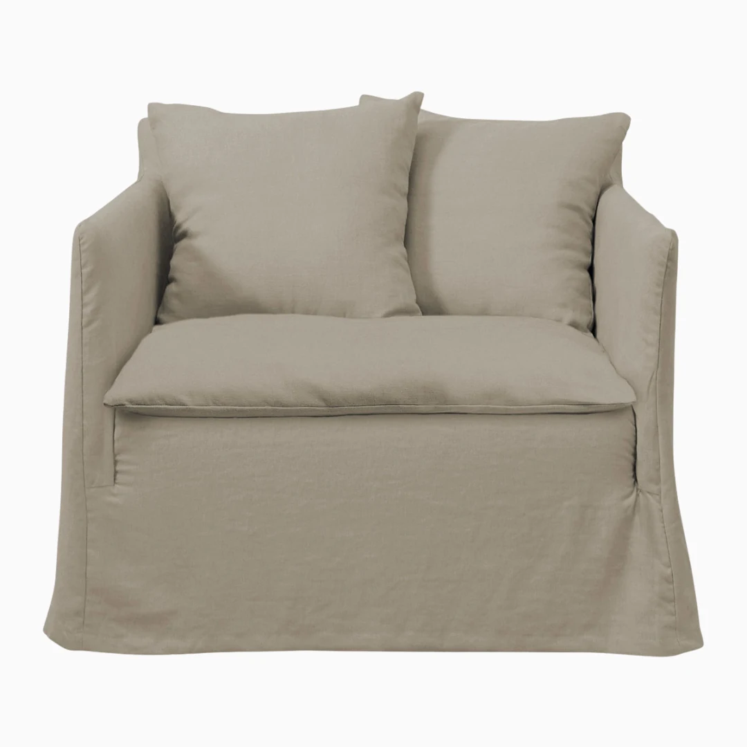 Completamente tapizado en lino o mezcla de lino, este sillón destaca por su textura suave y aspecto natural, que aporta luminosidad y un aire relajado al espacio. Su amplio asiento, dos cojines mullidos y delicados reposabrazos crean un asiento especialmente cómodo, perfecto para disfrutar de momentos de descanso o lectura.