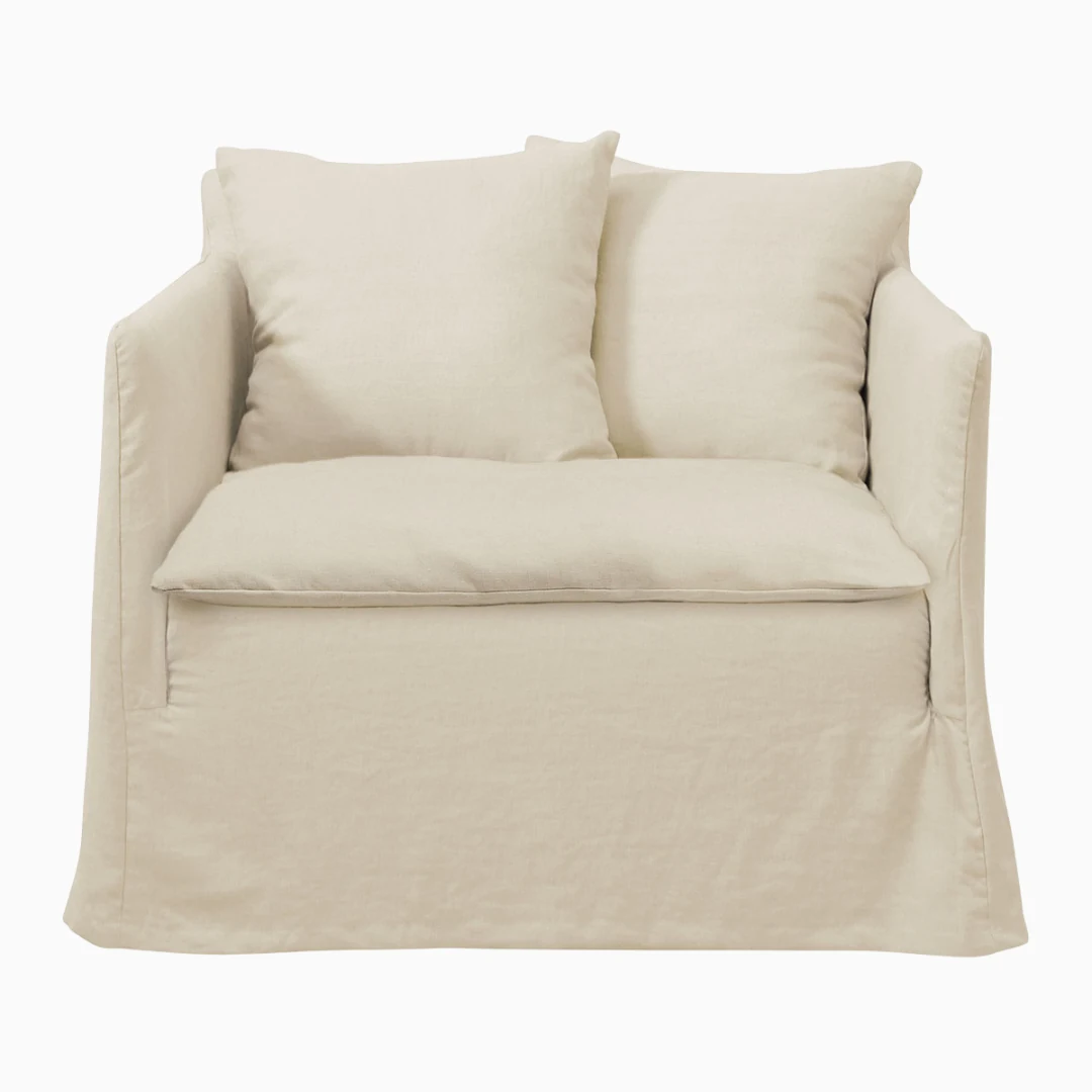 Sillón Gabriel de Blanc d’Ivoire tapizado en lino o lino mezclado, con cojines mullidos y estructura de haya maciza. Diseño elegante de 89 × 100 × 78 cm.