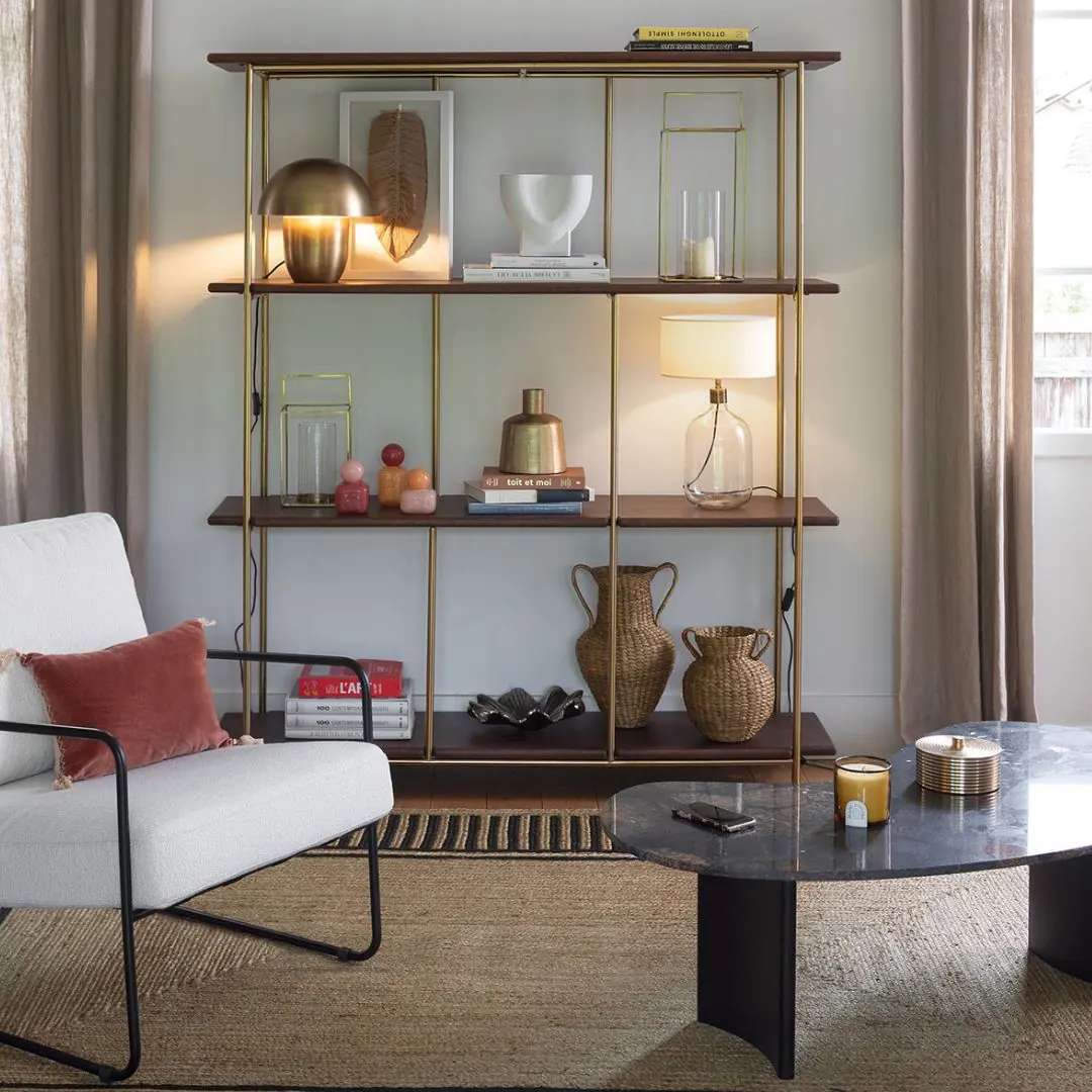 Combínalo con mesas auxiliares metálicas, lámparas escultóricas o alfombras texturizadas para crear un rincón acogedor y con personalidad. Su estructura visible lo convierte en una pieza protagonista sin resultar pesada visualmente.