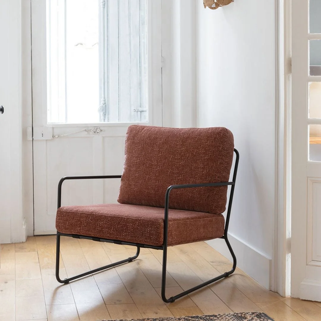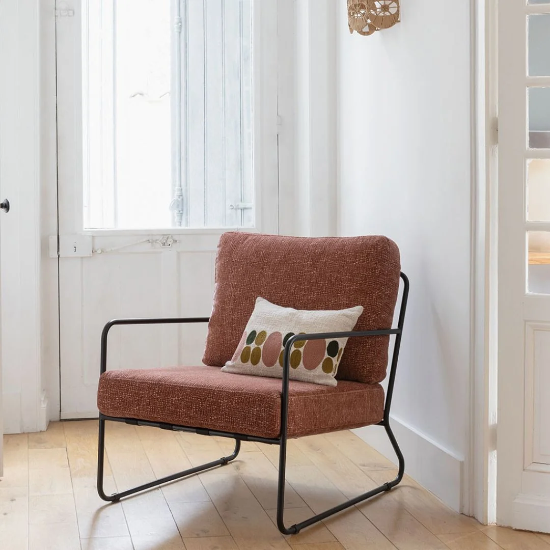 Su estructura de hierro aporta un aire moderno e industrial refinado, mientras que su asiento amplio y mullido garantiza una experiencia de confort inigualable. Gracias a su equilibrio entre firmeza y suavidad, GASPARD es el aliado perfecto para momentos de descanso, lectura o conversación.